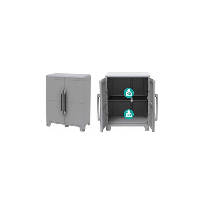 Armadio con cerniere in metallo che facilitano l'apertura e la chiusura delle ante. Maniglia in materiale bicomponente. Piedi regolabili in altezza. 1 ripiano interno modulare. Ideale anche per esterni. Resiste a temperature comprese tra i -5 e i +40 gradi. IP43. Protezione ai raggi UV. Dimensioni 78x43,6x101,6h cm