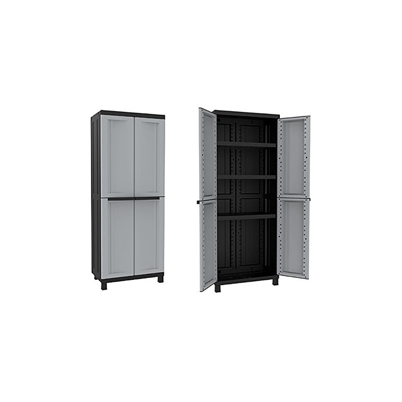 Armadio a due ante con tre ripiani interni regolabili, colore grigio e nero. Dimensioni (LxPxH) mm 680x390x1700.