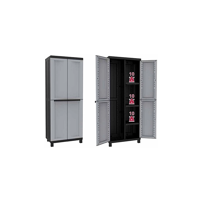 Armadio a due ante con tre ripiani interni regolabili, colore grigio e nero. Dimensioni (LxPxH) mm 680x390x1700.