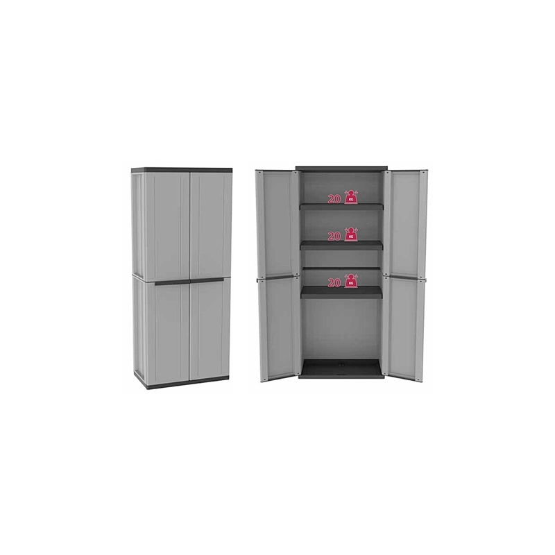 Armadio in plastica a due ante con tre ripiani interni regolabili, colore grigio-nero. Dimensioni (LxPxH) mm 680x375x1635
