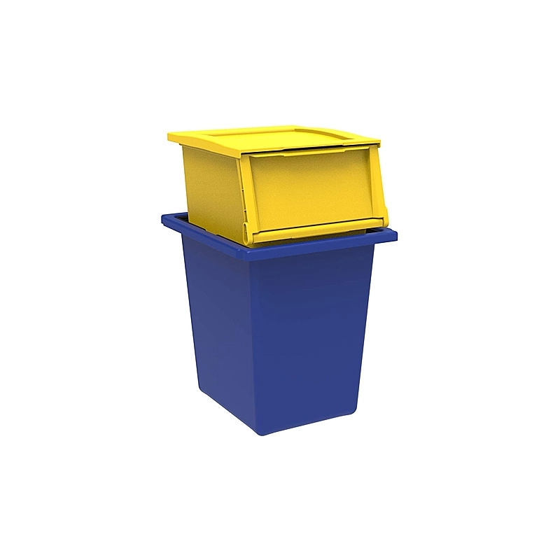 Set di 2 contenitori per il riciclaggio dei rifiuti. In polipropilene antiurto. Colori: 1 giallo (capacita' 25 lt) e 1 blu (capacita' 30 lt). Giallo dimensioni 32,5x29x37 cm con sportellino frontale. Blu dimensioni 33x38x38 cm con maniglie per agevolare il trasporto. Progettato per il massimo sfruttamento degli armadietti per raccolta differenziata ECOLINE.