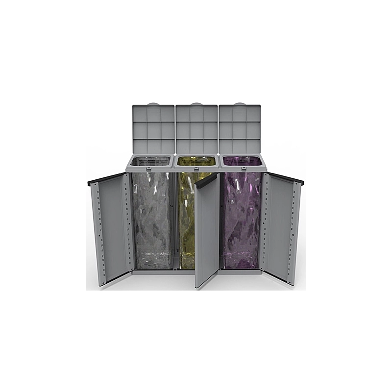 Armadietto ideato per la raccolta differenziata dei rifiuti. Dotato di sacchi da 110 lt ciascuno chiudibili con coperchio. L'apertura delle ante permette una facile estrazione frontale dei sacchi pieni. Adatto per utilizzo in ambiente esterno. Colore grigio. Modello = numero sacchi/numero ante/dimensioni cm