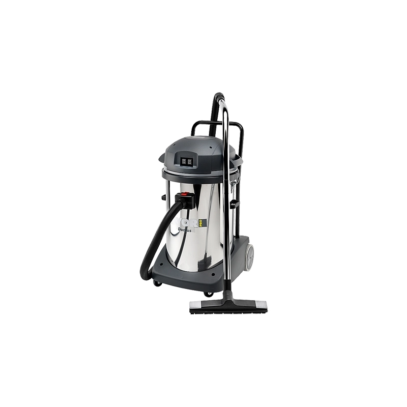 Aspiratore con 2 motori bistadio silenziati e fusto in acciaio inox. Potenza max 2400 Watt. Sistema anti-elettrostaticita'. Tubo di scarico da serbatoio. In dotazione: filtro in tessuto, spazzola per polvere e liquidi, lancia piatta, tubo flessibile da mm 40, prolunga rigida in acciaio e spazzola rotonda. Capacita' 78 lt.