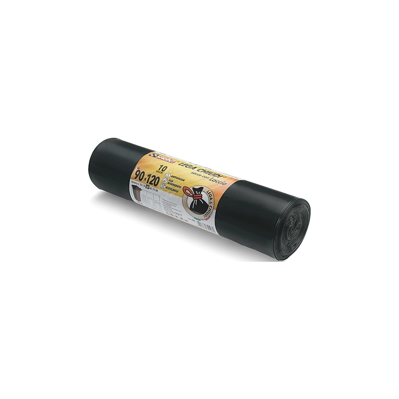 Sacchi in polietilene con laccio di chiusura. Saldatura laterale estesa antigoccia. Colore nero. Modello = dimensioni cm/capacita' lt/spessore micron/rotoli da pz