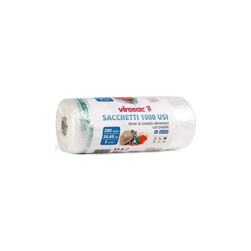 Sacchetti idonei al contatto alimentare con bretelle. Capacita' 5 lt. Dimensioni 34x60 cm. Ideali per: conservare, congelare, proteggere e trasportare. Rotolo da 200 pezzi.
