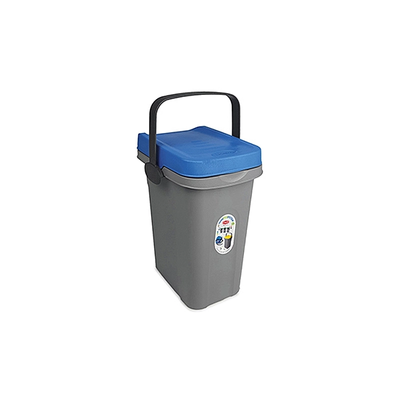 Pattumiera per la raccolta dei rifiuti organici, con guarnizione di tenuta in gomma nel coperchio e chiusura ermetica per evitare i cattivi odori, anello fermasacco, chiusura antirandagismo. Dimensioni 23x19x31h cm. Capacita' 7 lt. Colore grigio e blu.