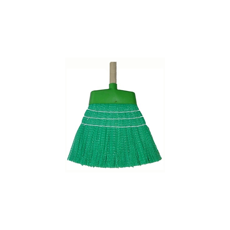 Scopa in setole plastica colore verde, tre fili. Lunghezza scopa mm 300, larghezza setole mm 300. Completa con manico in legno cm 120.