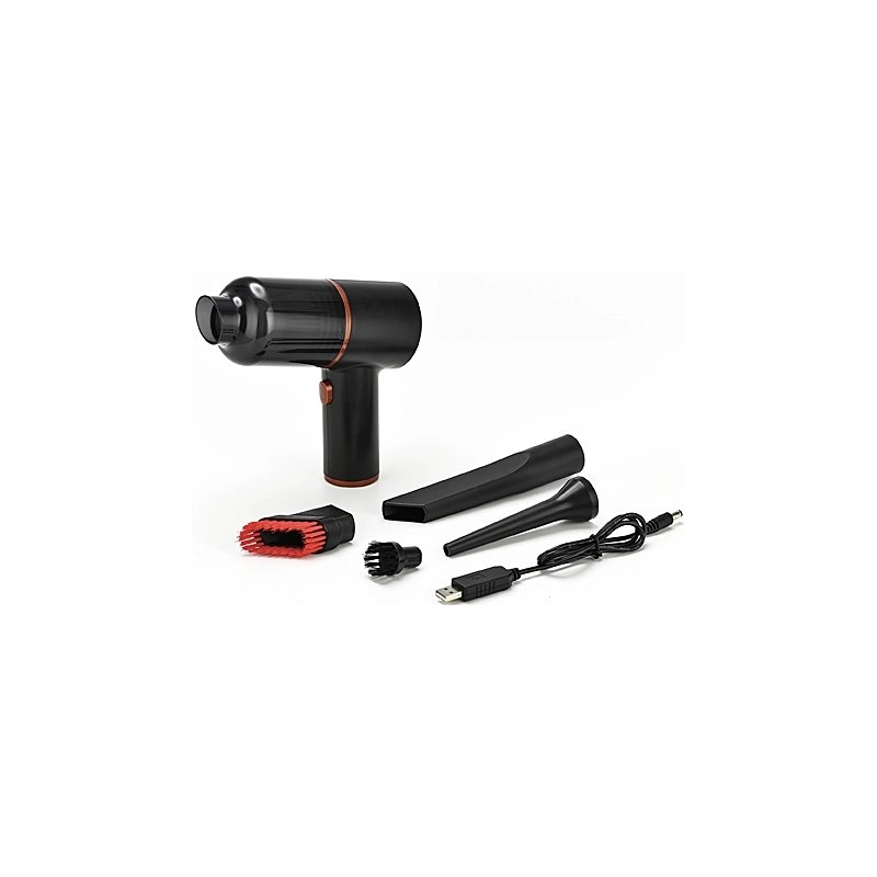 Aspiratore e soffiatore senza fili per auto. 12V, 120 Watt. Con 5 accessori inclusi: beccuccio lungo e piatto per la pulizia di fessure e spazi stretti, 1 spazzola piatta per pulire tessuti, 1 beccuccio per soffiare la polvere, 1 spazzolino per beccuccio utile per soffiare la polvere da prese d'aria o tastiere, 1 cavo usb per la ricarica.