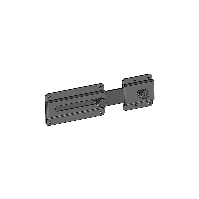 Catenaccio ribassato orizzontale con dispositivo di bloccaggio a molla. Lunghezza 22 cm. Colore nero. Studiato per essere applicato su scuri e persiane.