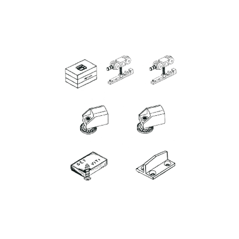 Composto da: 2 carrelli, 2 stop, 1 guida inferiore e viti di fissaggio. Modello = art./portata max kg/diametro ruote mm
