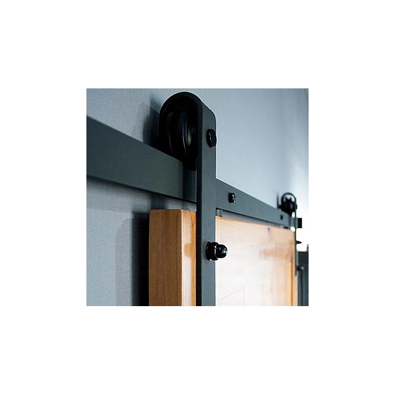Kit con binario a vista per anta singola. Per ante fino a kg 80. Composto da 1 monorotaia in acciaio lunghezza cm 200, 5 supporti per monorotaia, 2 carrelli in acciaio, 2 stop fine corsa e 1 guida inferiore in plastica. Colore nero e larghezza massimo anta cm 100.