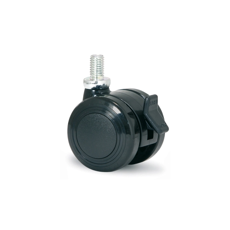 Ruota doppia in poliammide, rivestita in poliuretano con freno. Supporto in poliammide con perno filettato lunghezza 15 mm. Modello = diametro ruota mm/filetto/portata kg