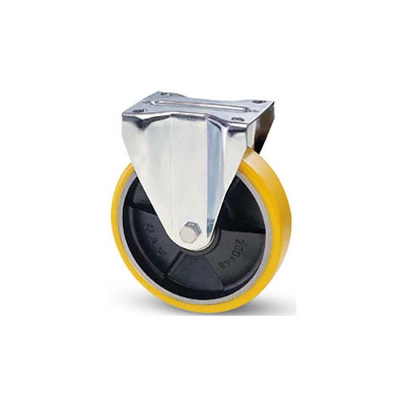 Ruota rivestita in poliuretano AVOLAN. Nucleo in ghisa di alta qualita' verniciato nero. Mozzo su cuscinetti a sfera schermati con distanziale centrale. Supporto con piastra fissa. Modello = diametro ruota mm/larghezza mm/portata kg