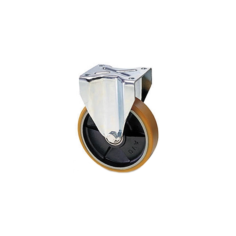 Ruota rivestita in poliuretano AVOPRENE. Nucleo in ghisa di alta qualita' verniciato nero. Mozzo su cuscinetti a sfera schermati con distanziale centrale. Supporto pesante con piastra fissa. Modello = diametro ruota mm/larghezza mm/portata kg