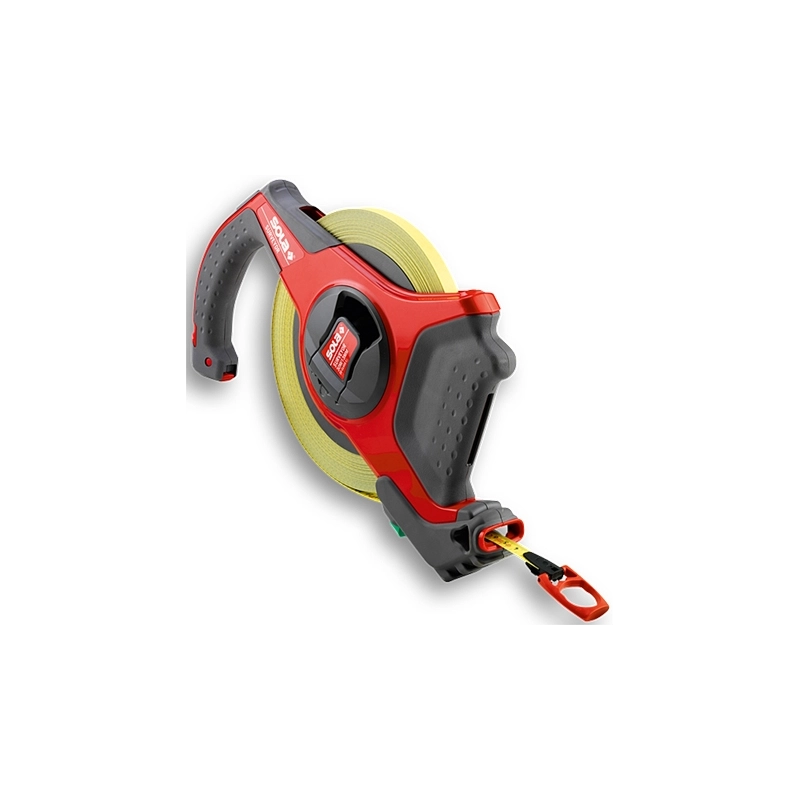 Impugnatura ergonomica antiscivolo. Riavvolgimento con moltiplicatore. Manovella di avvolgimento sia a dx che a sx. Chiodo ancoraggio integrato. Nastro in acciaio rivestito in fibra poliammidica giallo, larghezza nastro mm 13. Lunghezza 50 m