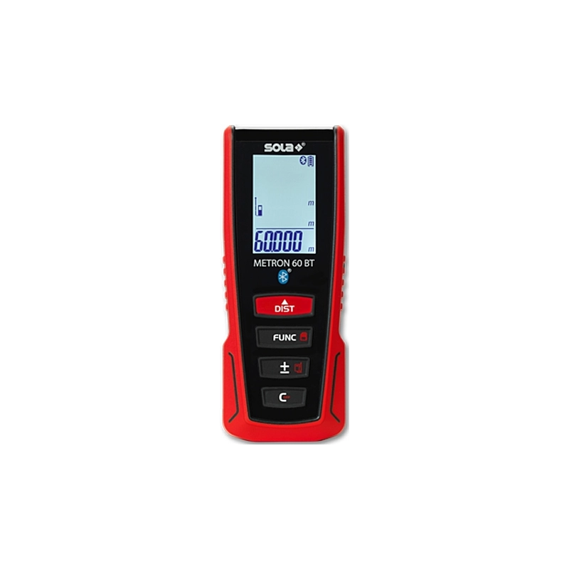 Misuratore laser compatto. Portata 60 mt. Precisione +/- 1,5 mm. Display illuminato con 3 righe valori. Funzioni: misura, misura continua, superficie, volume, Pitagora, memorizzazione dei valori, min/max, addizione e sottrazione. Dimensioni 119x46x28 mm. DIN EN 60825-1: 2007-10. IP54. Batteria ricaricabile al litio da 3,7 V. Interfaccia Bluetooth per utilizzare l'app SOLA Measures.