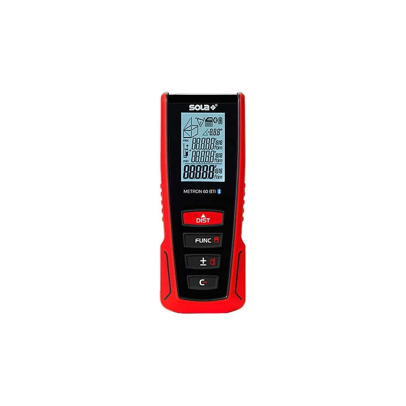 Misuratore laser compatto. Portata 60 mt. Precisione +/- 1,5 mm. Display illuminato a 3 righe. Funzioni: misura, misura continua, superficie, volume, min/max, addizione e sottrazione. Dimensioni 119x46x28 mm. DIN EN 60825-1: 2007-10. IP54. Batteria ricaricabile al litio da 3,7 V. Interfaccia Bluetooth per utilizzare l'app SOLA Measures. Parte terminale pieghevole per la misura dal bordo esterno.