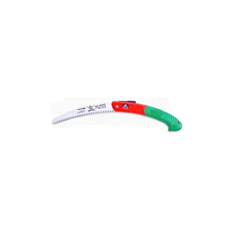 Seghetti con lama curva richiudibile, sblocco lama a pulsante. Lama con tripla affilatura, sezione conica, denti temperati ad impulsi. Ideale per quando si taglia sopra l'altezza della spalla. Lunghezza mm 210