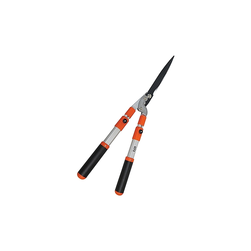 Tagliasiepi con lama ondulata cm 21 con sistema di taglio a leva. Manici telescopici in alluminio, lunghezza totale cm 65 chiuso, lunghezza totale cm 87 aperto.