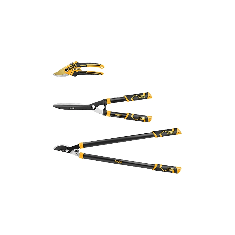 Set composto da 1 forbice per potatura 220 mm, 1 tagliasiepi da 557 mm e 1 troncarami da 725 mm.
