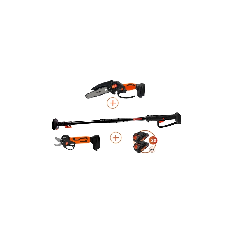 Kit composto da forbice potatura BRUSHLESS (21V Lithium da 2 Ah. Potenza 500 Watt. Capacita' di taglio massima 28 mm), elettrosega BRUSHLESS (21 V. 800 Watt. Lunghezza della barra 15 cm), asta telescopica da 108 a 163 cm. Con 2 batterie da 2,0 Ah.