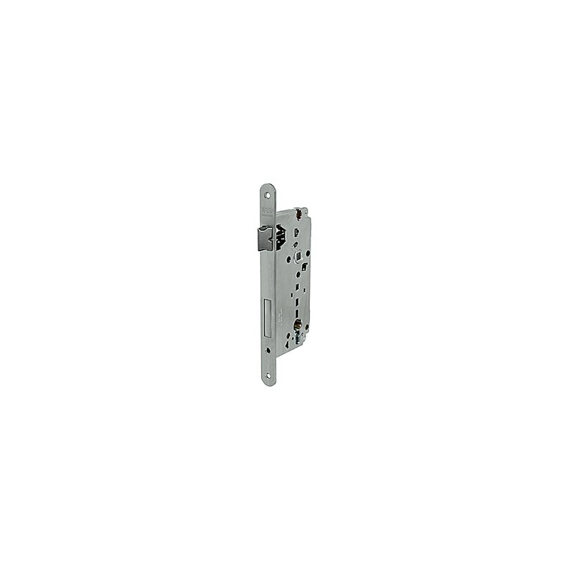 Scrocco reversibile con foro chiave yale, distanza fori mm.85. Frontale con bordo tondo, dimensioni mm.240x18. Entrata mm.50. Modello = finitura