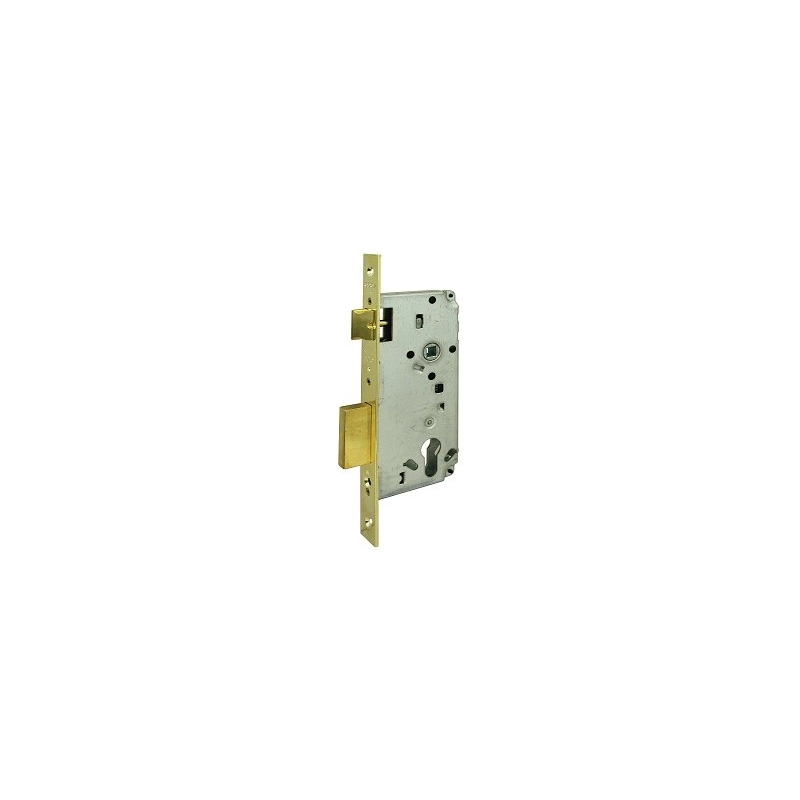 Per porte in legno. Scrocco reversibile e distanza fori mm.85. Frontale in acciaio ottonato, dimensioni mm.240x22. Modello = entrata mm./tipo di bordo