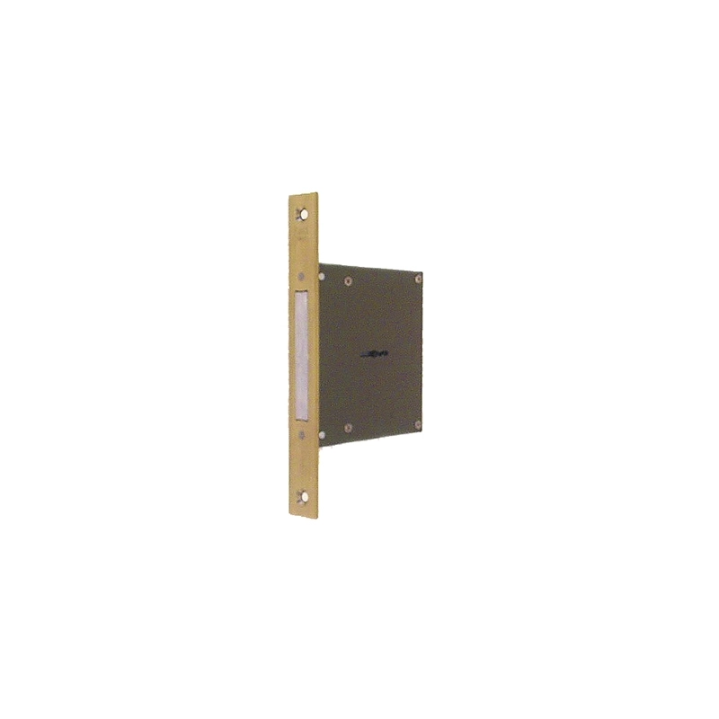 Catenaccio in acciaio nichelato, con chiave a doppia mappa, quattro mandate. Frontale in ottone satinato, dimensioni mm.180x22. Modello = entrata mm.