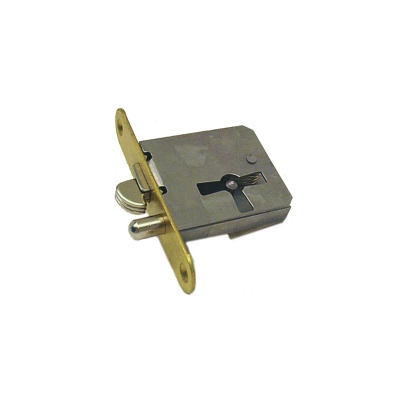 Con una leva a gancio, frontale in ottone con bordo tondo. Dimensioni scatola mm 43x35x9. Entrata mm 25. Fornita con chiave art. 79