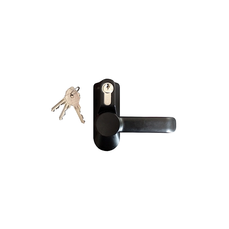 Placca con maniglia ribassata. Colore nero. In dotazione: cilindro con 3 chiavi e viti di fissaggio. Per maniglioni serie "FAST PUSH" e "FAST TOUCH".