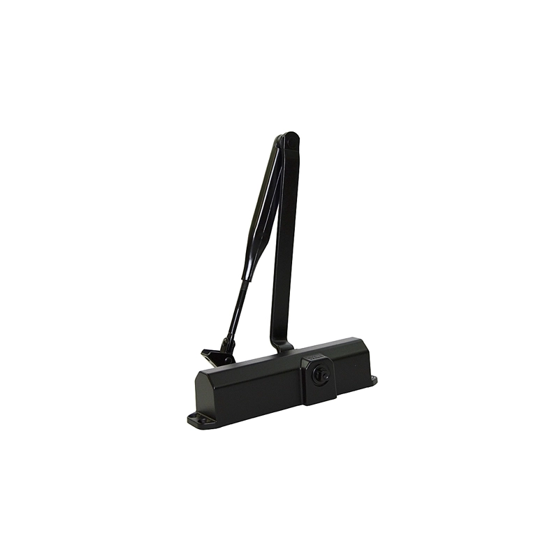 Velocita' e forza di chiusura regolabili, completo di braccio d'arresto a scatto con dispositivo di disinserimento. 3 forze di chiusura: forza 2 per porte da 850 mm, forza 3 per porte da 950 mm e forza 4 per porte fino a 1100 mm. Colore nero