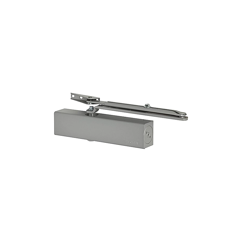 Corpo monoblocco in alluminio. Braccetto in acciaio senza arresto. Valvola di regolazione con registro termostatico. Forza, velocita' di chiusura, potenza del colpo finale e posizione arresto porta regolabili. Larghezza max porta cm 110, peso kg 80. Certificato per porte tagliafuoco. Colore argento