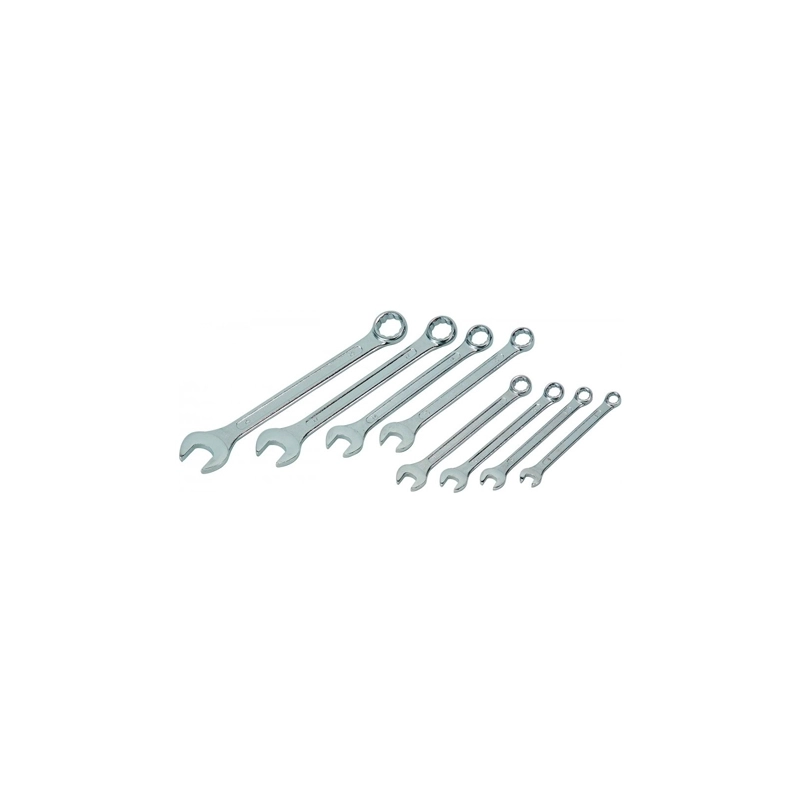 Set di chiavi combinate. In acciaio al cromo vanadio, satinate, testa lucida, testa poligonale piegata a 15 gradi. Modello = numero pezzi/misure