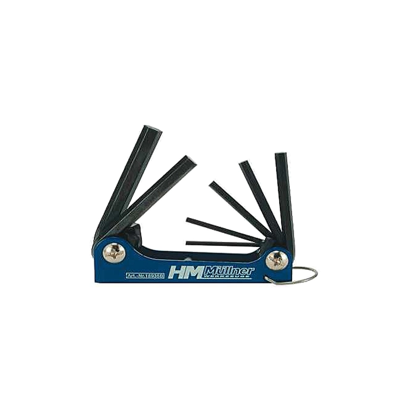 Serie 7 pz. chiavi maschio esagonale mm 2,5-10. In acciaio al cromo vanadio, brunite. Fornite con supporto in metallo pieghevole.