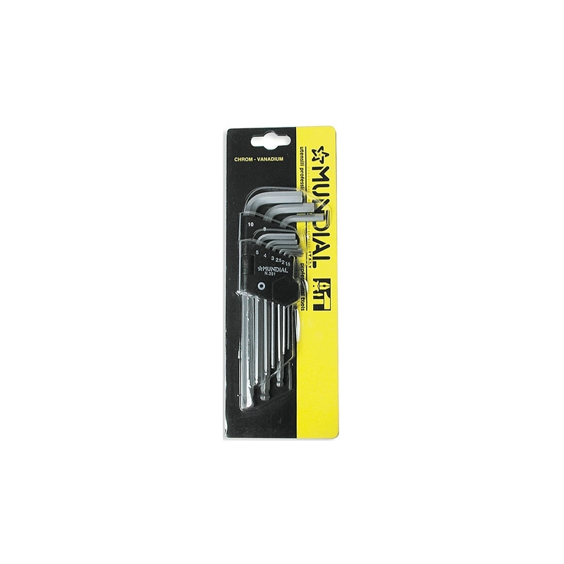 Serie 9 pezzi chiavi maschio esagonali lunghe, estremita' sferica di misure: 1.5, 2, 2.5, 3, 4, 5, 6, 8, 10. Con clip in plastica.