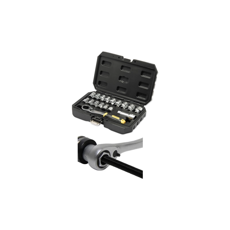 Kit 17 bussole e cricchetto ribassato con foro passante. Cricchetto a profilo multiplo. Attacco 3/8''. Misure da 10 a 24 mm. In valigetta.