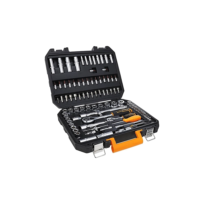 Contenuto 94 pezzi assortiti tra: 2 cricchetti, bussole, prolungate, bussole per candele, snodo, bits, prolunghe, ecc.