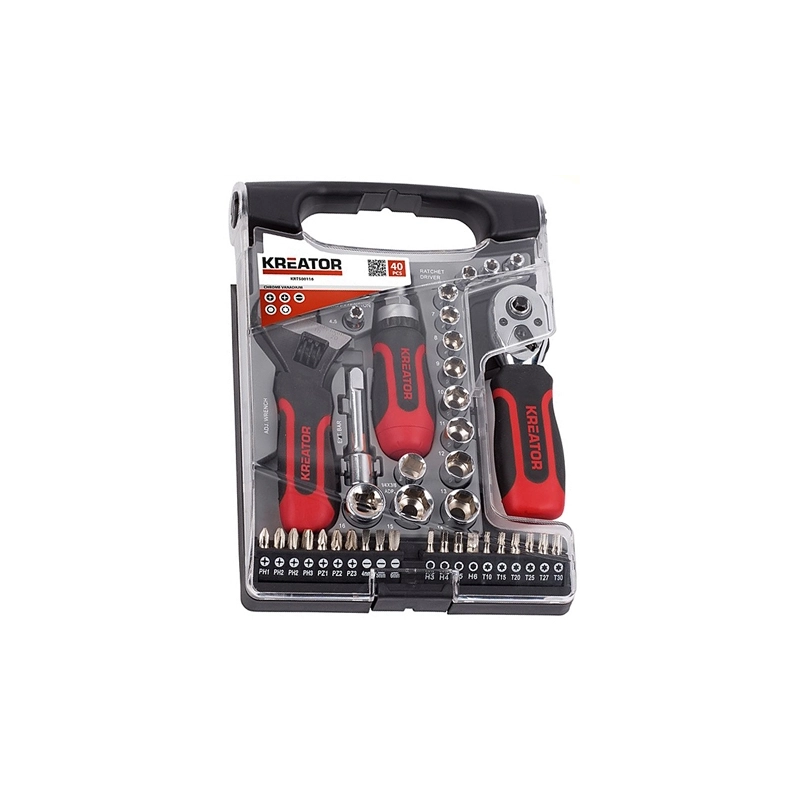 Serie da 40 pezzi: 10 bussole 1/4" - mm 4/4,5/5/6/7/8/9/10/11/12 - 4 bussole 3/8" mm 13/14/15/16 - 20 Inserti RESISTORX T10/T15/T20/T25/T27/T30 - CROCE PH1/PH2/PH3 - POZIDRIVE PZ1/PZ2/PZ3 - TAGLIO mm 4/5/6 - ESAGONALE mm 3/4/5/6 - 1 adattatore da 1/4" a 3/8" - 1 Chiave a rullino - 1 portainserti magnetico mm 60 - 1 prolunga 3/8" mm 75 - 1 cacciavite a cricco - 1 cricchetto attacco 1/4"+ 3/8".