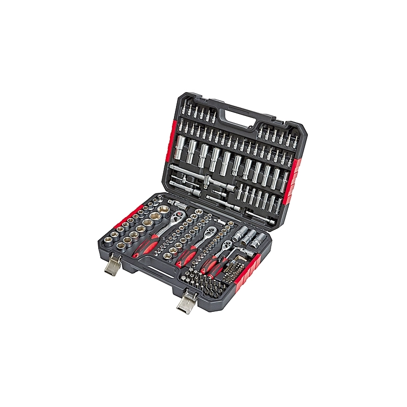 Contenuto: cricchetti attacco quadro reversibili da 1/4" + 1/2" + 3/8'', bussole da 1/2"-3/8''-1/4'', bussole prolungate, bussole per candele, inserti varie forme, snodi, prolunghe, 1 porta inserti, 1 chiave scorrevole