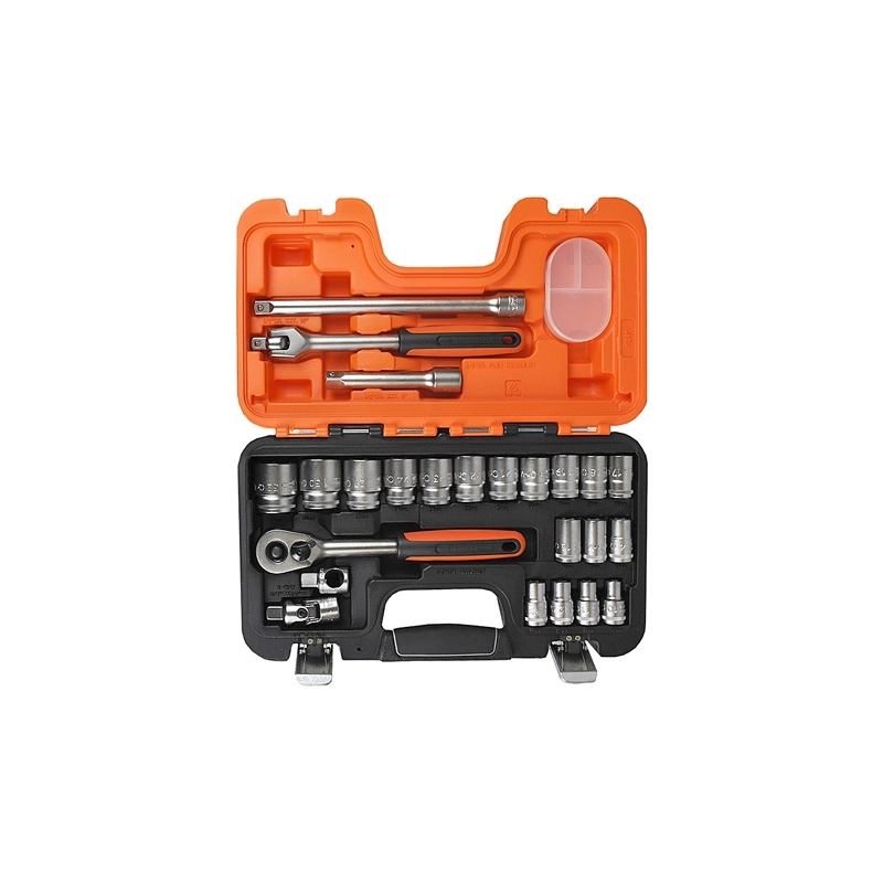 In valigetta di polietilene. Contenuto 24 pezzi: 18 bussole da mm.10 a mm.32. 2 prolunghe mm.50-150. 1 barra a T scorrevole. 1 giunto universale. 1 manico fessibile. 1 Cricchetto reversibile 54 denti