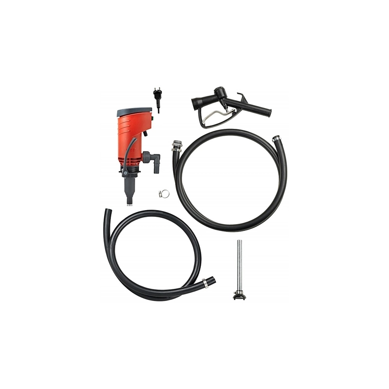 Kit elettropompa travaso. Completo di pompa, tubo di erogazione da m 4 e tubo di aspirazione da m 1.6 con filtro. Per gasolio, olio, kerosene, non utilizzabile per benzina, diluenti, acqua. Erogazione 52 l/min.