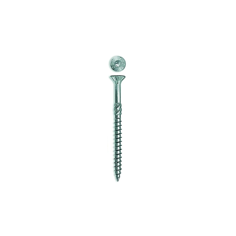 Viti in acciaio inox A2 AISI304. Testa svasata piana a cava torx. Alesatore e filetto brevettati. Certificata CE secondo EN 14592:2008 per applicazioni strutturali su legno. Modello = diametro mm/lunghezza mm/filettatura