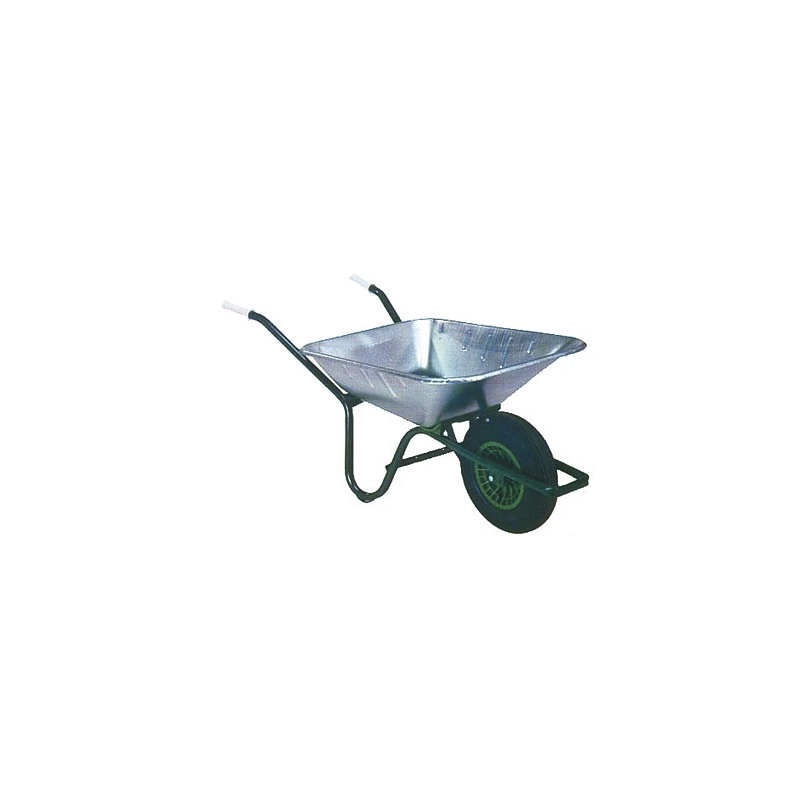 Carriola con vasca in acciaio zincato. Telaio tubolare in acciaio verniciato. Ruota mm 400x100 con pneumatico rinforzato a 2 tele e mozzo su cuscinetti. Volume l 90