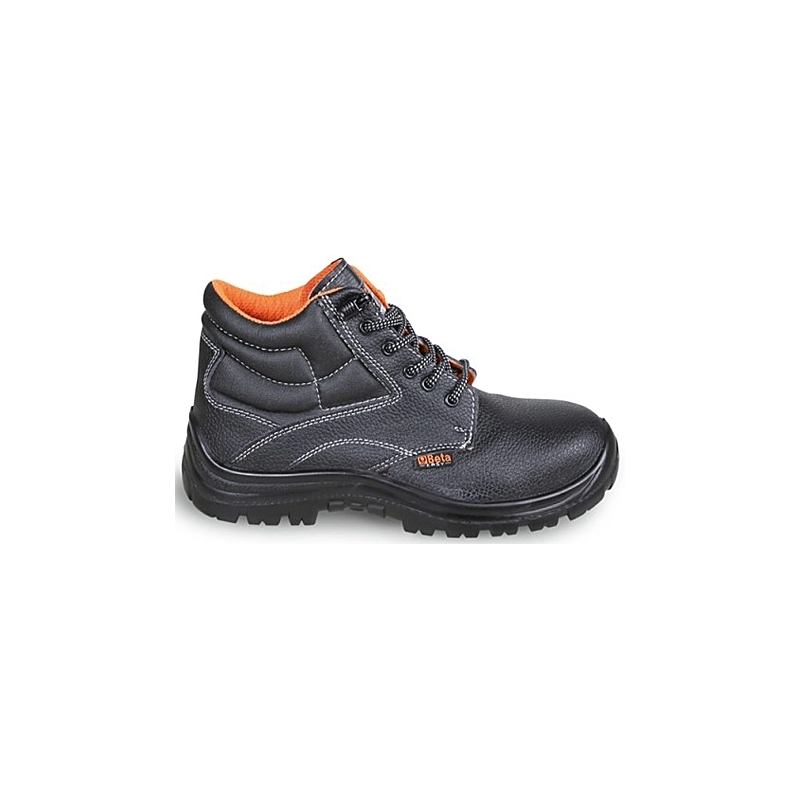 Tomaia in pelle pigmentata stampata idrorepellente. Suola in poliuretano bidensita'. Puntale in acciaio, resistenza 200 J. Sottopiede Carbon in feltro. EN ISO 20345:2011. Modello = taglia