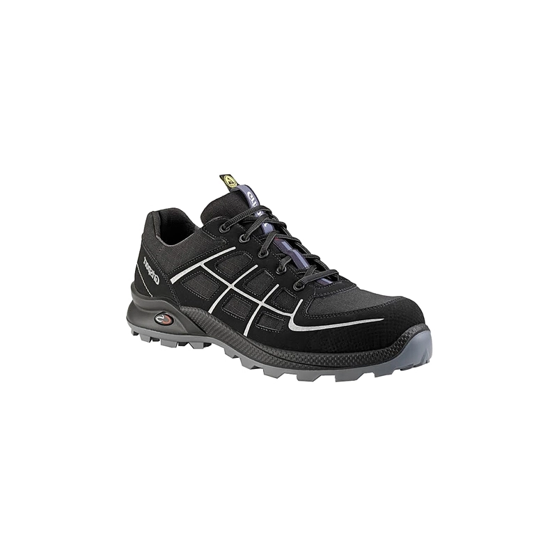 Tomaia in tessuto Poly + microfibra colore nero + inserti riflettenti. Puntale in composito, lamina non metallica. Suola in poliuretano + gomma + ESD. Scarpa Cat. S3 HRO HI SRC ESD. Modello = taglia