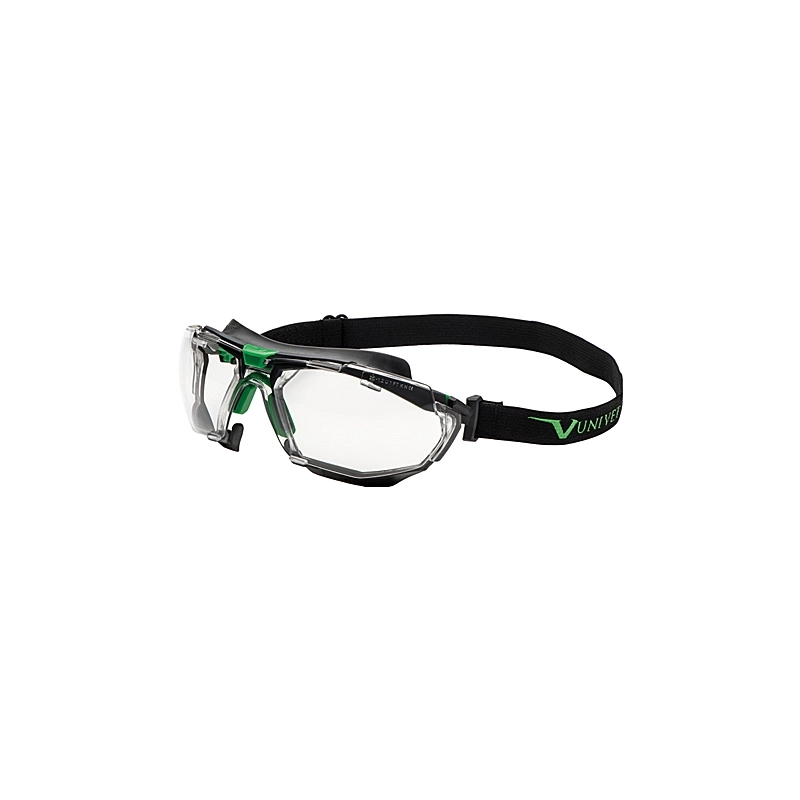Occhiale certificato EN166 punto 3 per la protezione da gocce e spruzzi. Lenti trasparenti antiappananti e antigraffio. Montatura con tecnologia lente flottante. Gasket in soffice gomma per un morbido appoggio sul viso. Elastico con aggancio a scatto.
