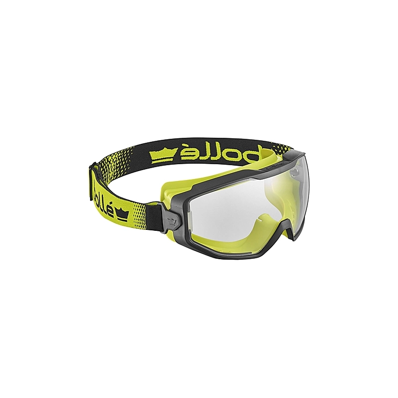 Occhiali con lente trasparente in policarbonato da 2,5 mm. Montatura in PC/TPR. Banda elastica in poliestere/spandex da 250 mm. Trattamento Platinum (antigraffio e antiappannamento permanente). Telaio in PC/TPR CO - iniettato per un comfort ottimale. Nasello dentellato per adattarsi a tutti i visi. Visione panoramica ottimale. Certificato per polveri, liquidi e gas.