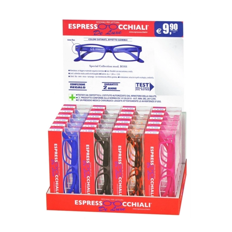 Espositore da banco con 24 occhiali. Completo di specchio, test per autodiagnosi della vista. Assortimento composto da 4 finiture o colori per 6 diottrie (da 1 a 3,5). Dimensioni (lxpxh) cm: 27x21,5x36. Conformi UNI EN ISO 9001:2015. Modello = Mod. occhiali