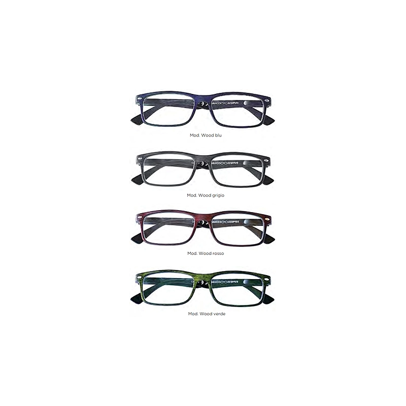 Occhiali per lettura con montatura con colori sfumati unisex. Aste flessibili con meccanismo a molla. Lenti asferiche, sottili e infrangibili, con trattamento antigraffio e antiriflesso. Conformi UE 2017/745. Modello = correzione diottrie/colore