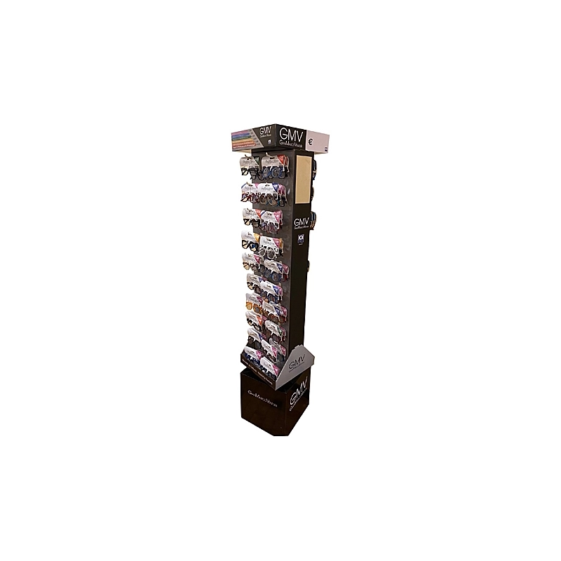 Espo composto da 160 occhiali da lettura Gian Marco Venturi . In 4 modelli (Milano, Torino, Venezia e Firenze) e 4 colori diversi ciascuno. Per ogni modello, colore e diottria da 1,00 a 3,50 in numero proporzionale alle statistiche di vendita. Include specchio, test per autodiagnosi visiva e vano scorte. Supporti con antitaccheggi per evitare furti.